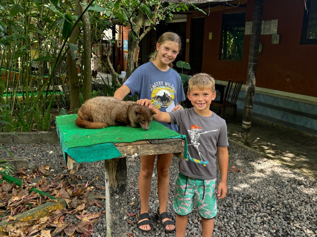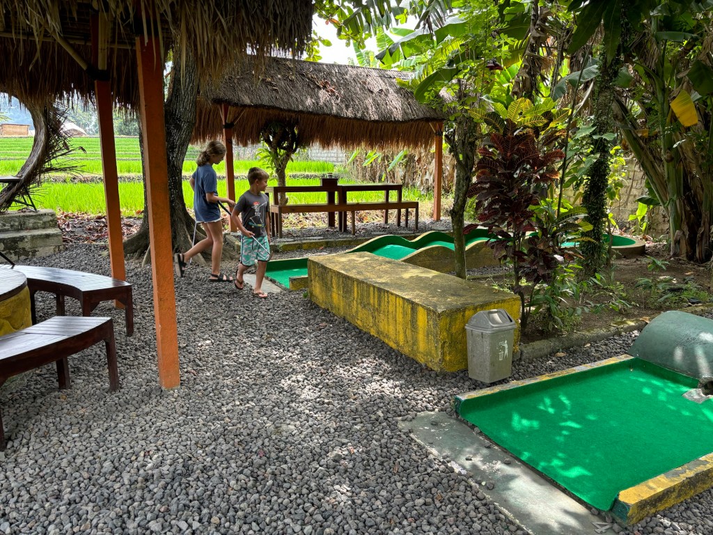 Next up was mini golf. Jack has been asking to play mini golf for 2 months so we had to hunt one down in Bali. We did, about 20 minutes up the road from our house. It was tucked in a lil’ jungle off the side of the road. To our surprise, we even got to pet the local Lewak who was just lounging around!