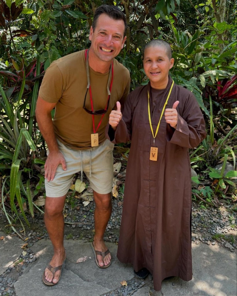 We crushed the mindful walking so much so that we lost the group. Guess we had mindfully hung a Louie when a Ricky was required, whoops! It’s hot in the jungle. We were now mindful that we couldn’t find a group of 50 people. We hustled up and down hills, over bridges, sweating, sweating. Finally, we were pointed in the right direction.