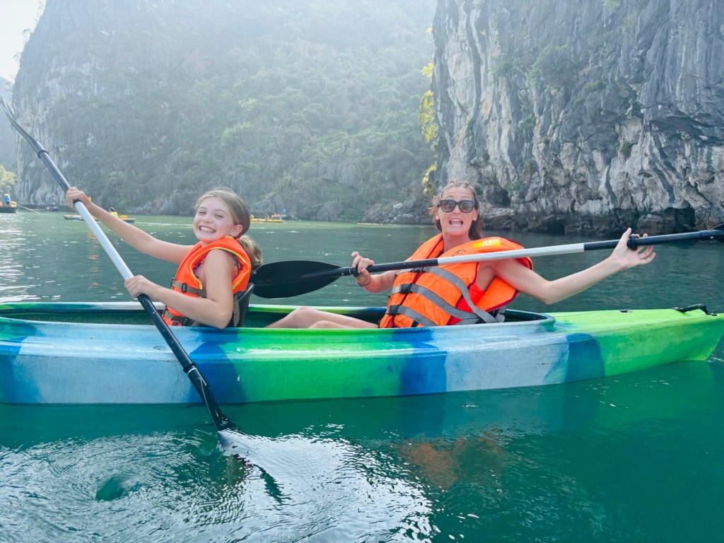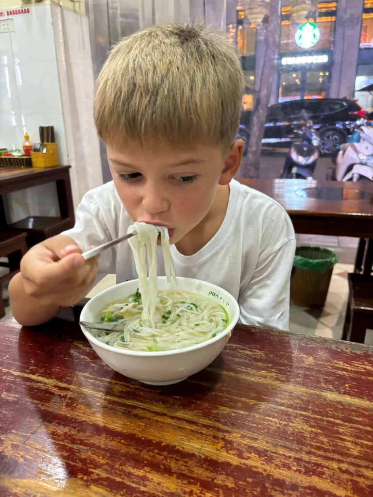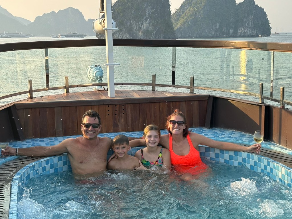 It was lovely, kinda cheesy as well. We sat for lunch and a safety speech upon arrival. The lunch was 87 courses. You know, the kind where one good course probably would have done better than the 87 sub par to moderate course at minimal size. Eh, it’s the ambiance, we got the schtick. It was yummy. Aboard our boat were 10 cabins, a rooftop pool and bar area, and views of the majestic bay as far as the eye can see. We made friends with a traveling group of Aussies, fleeced happy hour, swam and kayaked through the bay. Jack claims the Halong Bay Kayak was the highlight of his Vietnam trip, especially when he and Daddy went fast. Shortly after our kayak the boat crew realized there was a mistake. They had placed us on a 3 day 2 night boat and we were supposed to be on the 2 day 1 night boat. Whoops. It was annoying because the one activity the kids wanted to do was squid fishing. That was 86’d because we had to transfer boats. We threw a stink but it didn’t matter, off this boat onto the next. Boat 2 was actually way nicer. Honestly, it was stuffy though. Surprise surprise, a friendly Vietnamese employee stepped in and scrambled to get the kids fishing poles. They didn’t catch any squid but Halong Bay had been salvaged in Jack and Lyla’s eyes. Kids to bed, a few gratis glasses of wine for mom and dad, bedtime.