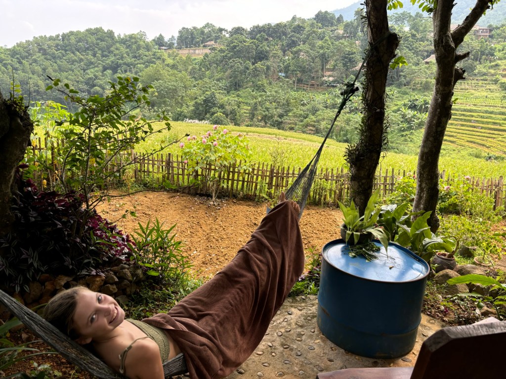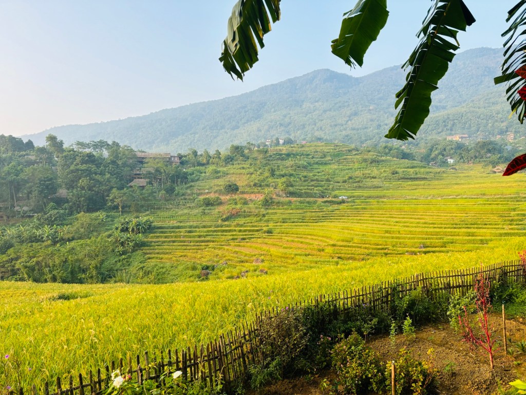 Upon arrival we were met by Dzuy, our hotel manager. Hotel is an inappropriate word. It was a bamboo set of treehouse / structures built upon a stunning valley. Nature rarely presents herself so beautifully. Mid perch on a Vally our view wandered over green and golden rice terraces. Steep mountains that lay like the dragons of Halong Bay. Jungle, sprinkled with Palm and Acacia trees and a vast blue sky. We felt our heart rates drop by the second. The staff served a family style dinner with chicken skewers, veggies, rice, and…….margaritas. We settled into our bamboo home awaiting 3 days of beauty and peace. Expectations were met.