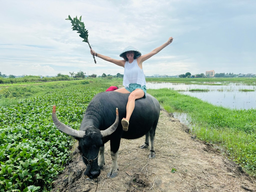Finally, we could not walk anymore so we rented bicycles from our hotel. Through a few narrow alleyways we went until we entered a valley of beautiful rice fields connecting Hoi An with an ancient village of vegetable farmers, Tra Que. Before entering we saw a silly set of local farmers posing on a water buffalo. Tourist trap accepted! Jack was the first to hop on the great buffalo (remember the Asian reverence for little boys?). Then the whole family partook. What a riot! God Bless those farmers, they charged us an ungodly amount…..but you cannot replace those pictures and those laughs!
