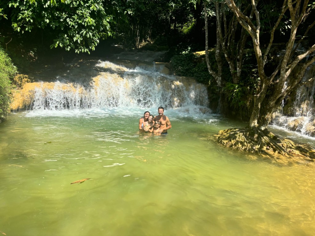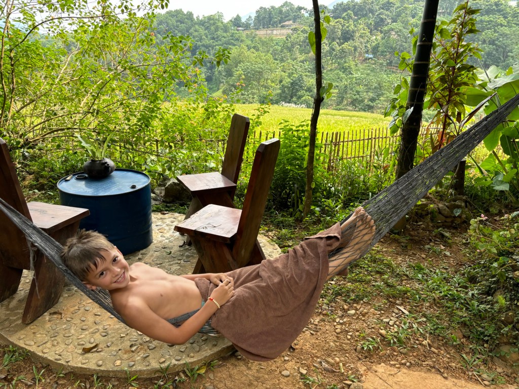 A third of the way through we rested at a weaving village. Local grandmothers were making vibrant scarfs in front of us! As we trekked on the reality of hiking what would be 7 miles with children was settling in. But on we went, no turning back now! Miles more of beauty onward we stopped one last time at a small shop in a local village for apples. The store owner, a middle aged woman jumped to meet us. Tall healthy westerners are rare in this part of Vietnam. She was so interested that she grabbed and touched every part of every one if us in the most loving way. Then she called her 82 year old mother out. Grandma was most interested in Jack. Asian culture reveres boys, Jack has gotten used to being fondled by every Grandma we come across. 2 hours after leaving that sweet family we arrived at the waterfall and boy did that cold water feel excellent! Days later driving to the airport Amanda and I would place the hike as our favorite part of the trip, so beautiful!