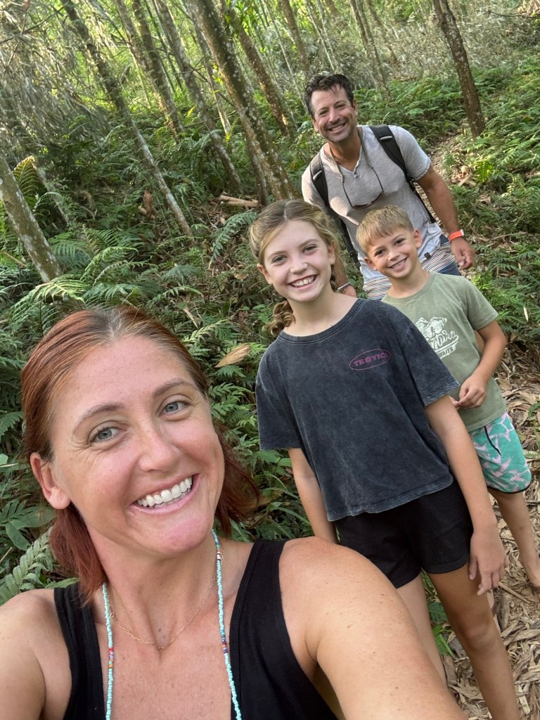 Breakfast and coffee in our belly we are ready to set off for our big adventure. A 10km hike through the jungle, rice field, and local villages to a waterfall. We were totally prepared for this 3.5 hour hike with a 10 and 7 year old child. Snacks, nope. Hiking shoes, slip slaps it is! Hats for sun protection – who needs ’em! Let’s go.